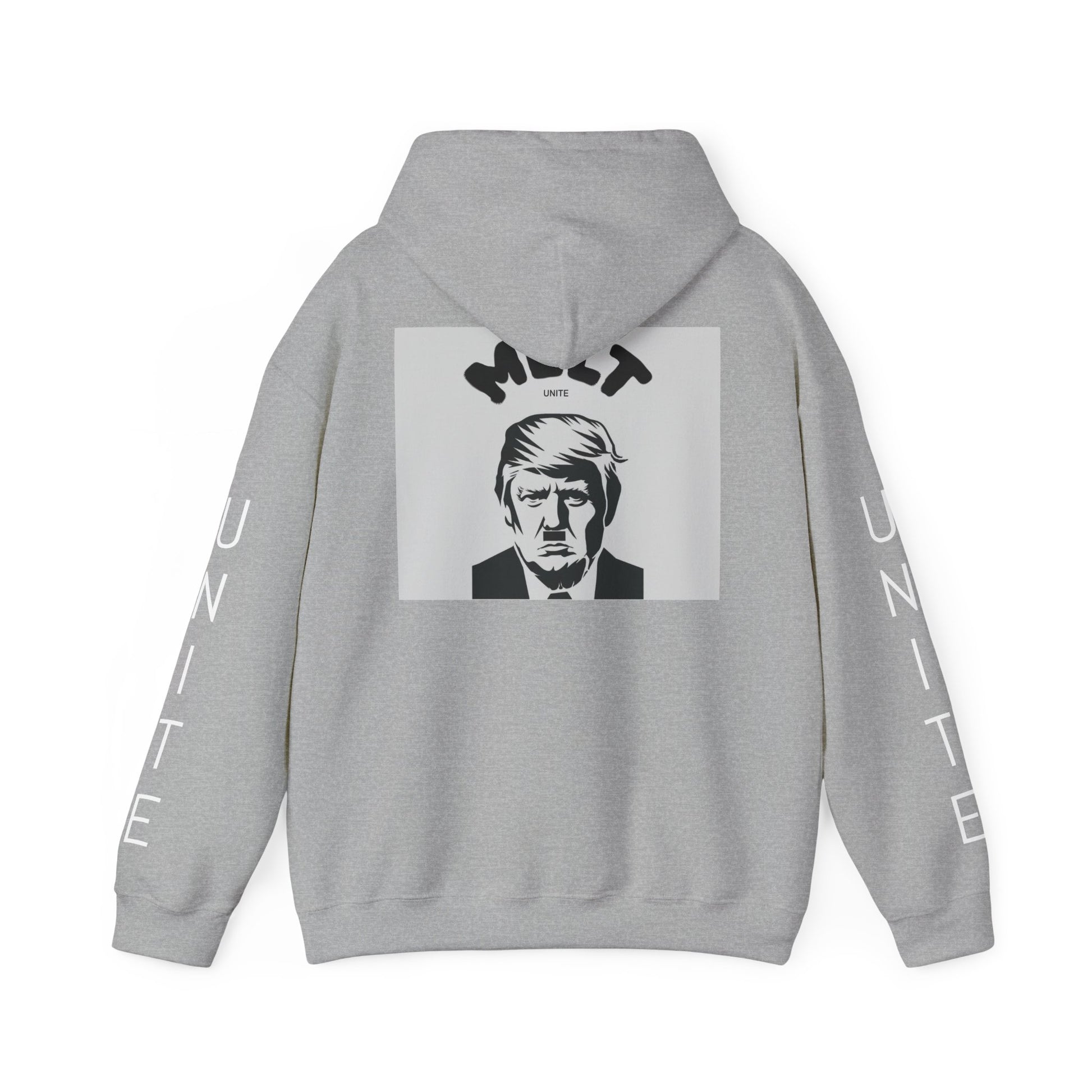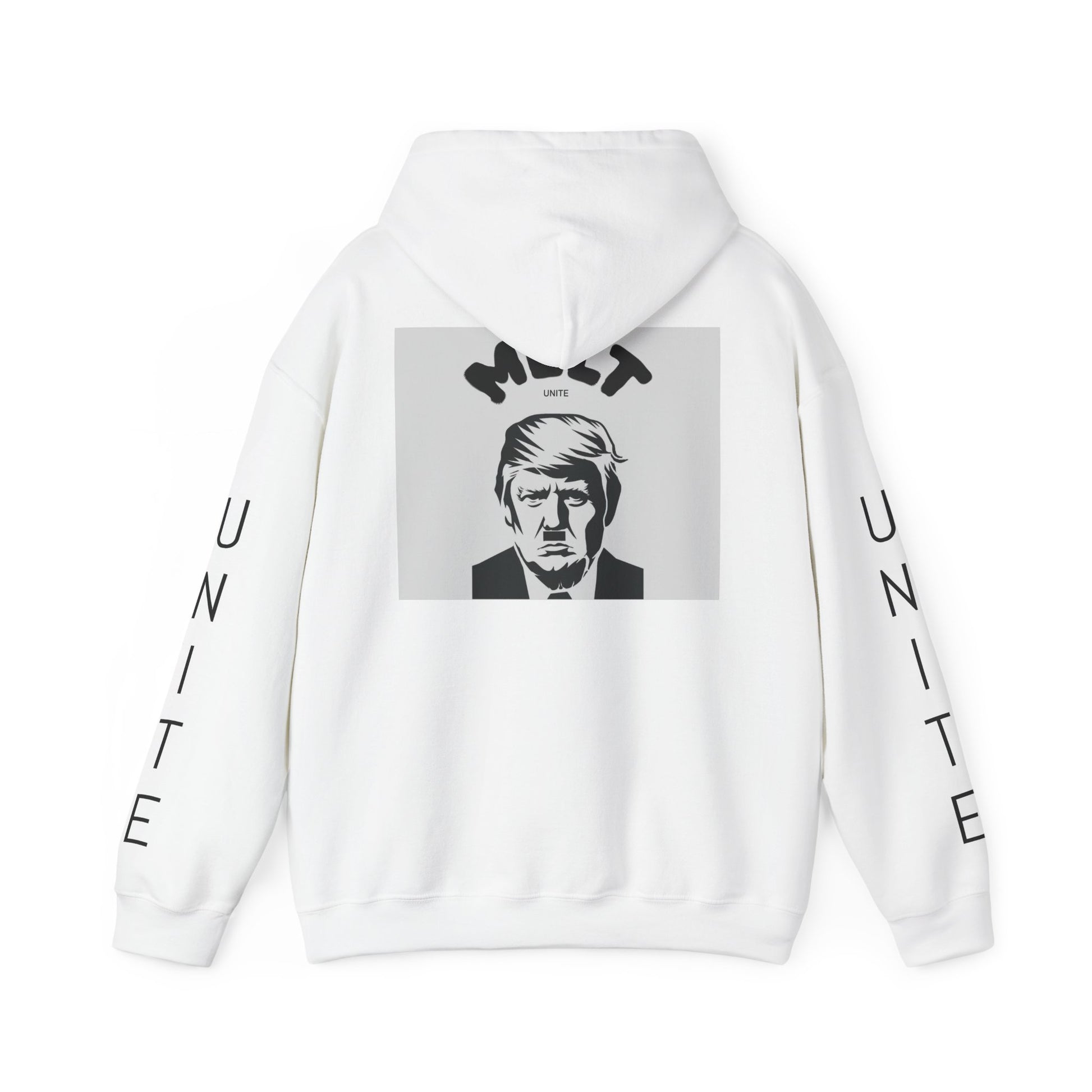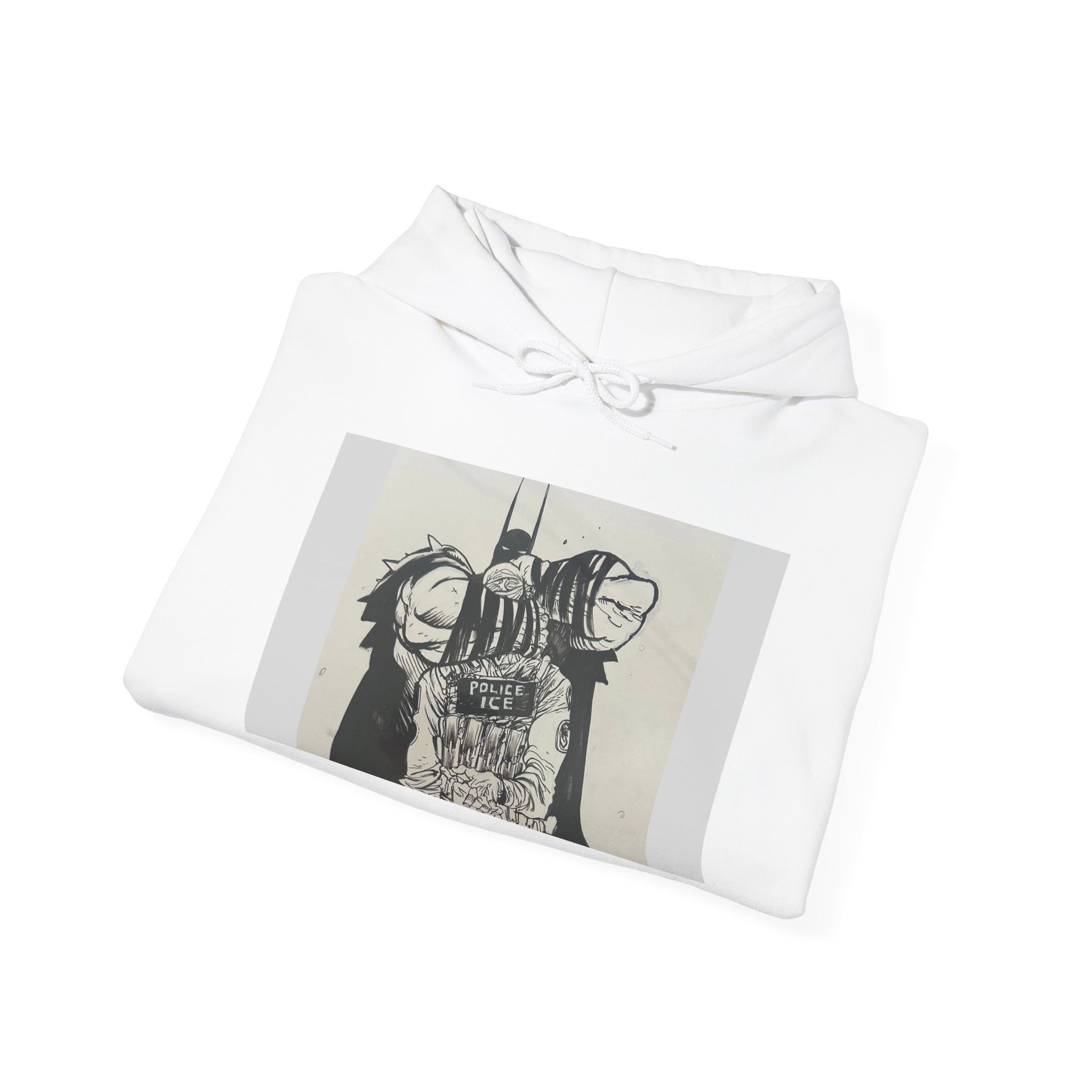 This hoodie carries a quiet, confrontational energy—soft to the touch but bold in attitude. The front shows a grainy, expressive portrait that feels hand-sketched, and the back repeats the stark monochrome face with a crown-like motif above it. Slim, vertical lettering down each sleeve spells out a single strong word, giving the piece a streetwise, poster-art vibe. Slip it on when you want warmth without losing edge. The roomy pouch keeps your hands cozy on cool evenings. Wear it with lived-in denim, a beanie, and headphones for walks through the city or late-night meetups where the look is more statement than label.