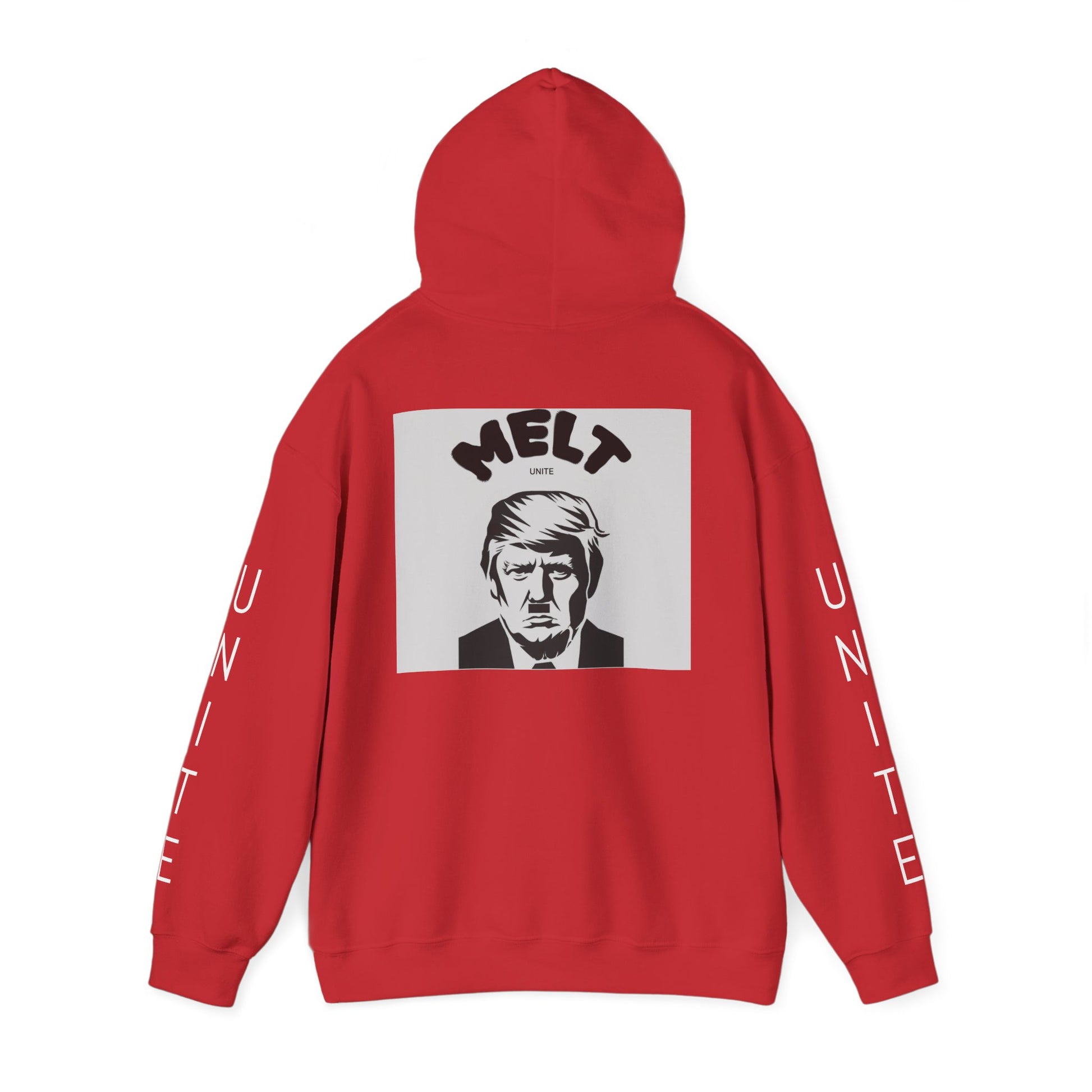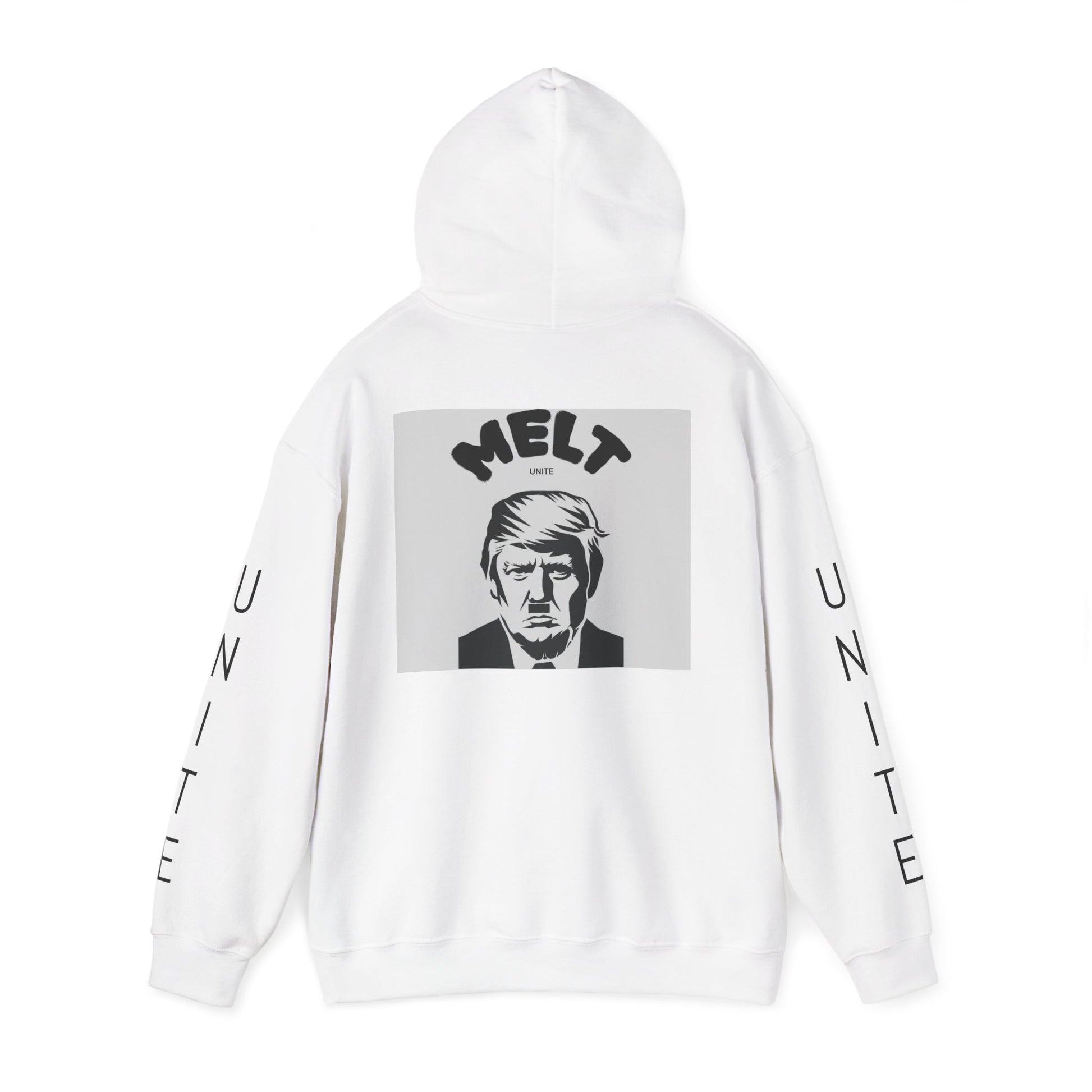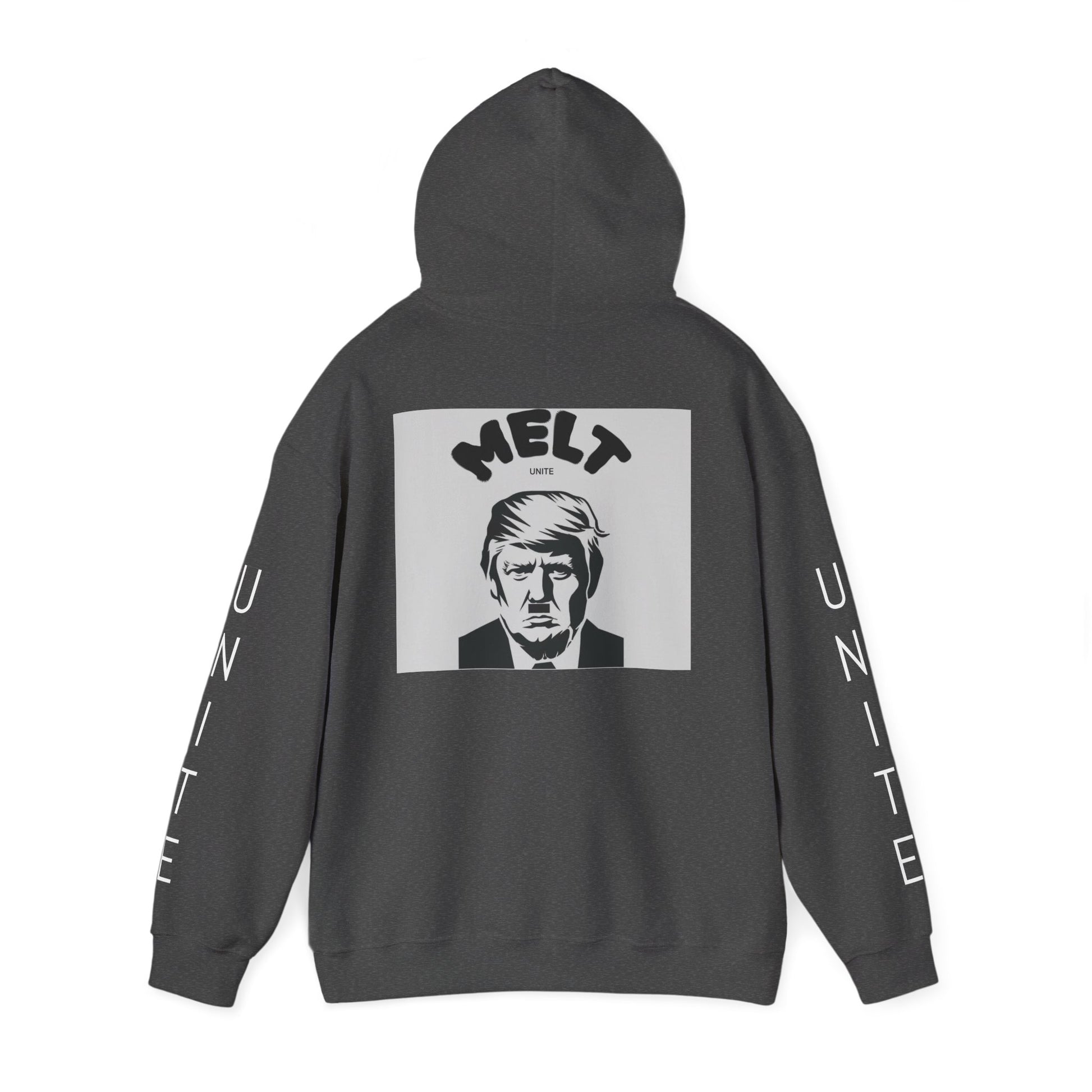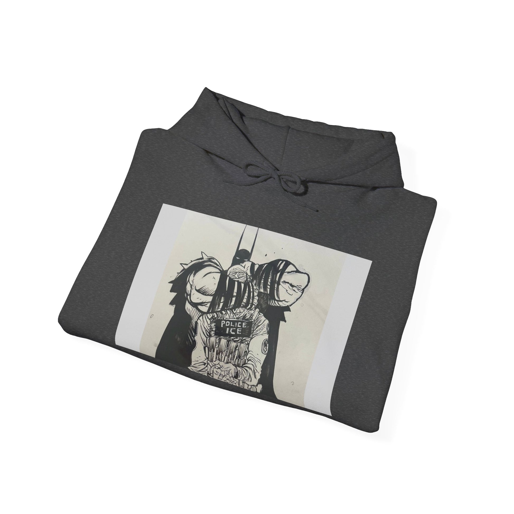 This hoodie carries a quiet, confrontational energy—soft to the touch but bold in attitude. The front shows a grainy, expressive portrait that feels hand-sketched, and the back repeats the stark monochrome face with a crown-like motif above it. Slim, vertical lettering down each sleeve spells out a single strong word, giving the piece a streetwise, poster-art vibe. Slip it on when you want warmth without losing edge. The roomy pouch keeps your hands cozy on cool evenings. Wear it with lived-in denim, a beanie, and headphones for walks through the city or late-night meetups where the look is more statement than label.