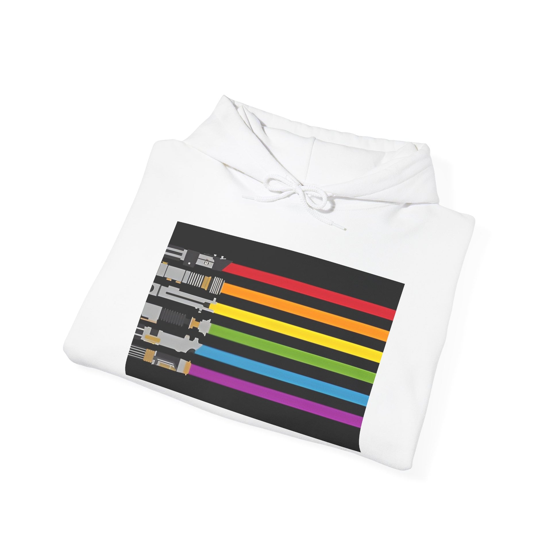This cozy, mid-weight hoodie brings playful fandom into everyday wear. Soft and substantial, it wraps you in a warm, slightly structured fit with a double-lined hood and color-matched drawcord. A bold, rainbow-accented Star Wars graphic anchors the back, while the front features a compact, colorful lightsaber lineup. Disney logo prints run down both sleeves for extra character. The roomy kangaroo pocket and tear-away label keep comfort front and center, and the tubular knit eliminates side seams for a smooth, clean silhouette. Wear it to movie nights, conventions, or long drives — it reads like an inside nod to fellow fans while staying comfortable for all-day wear.