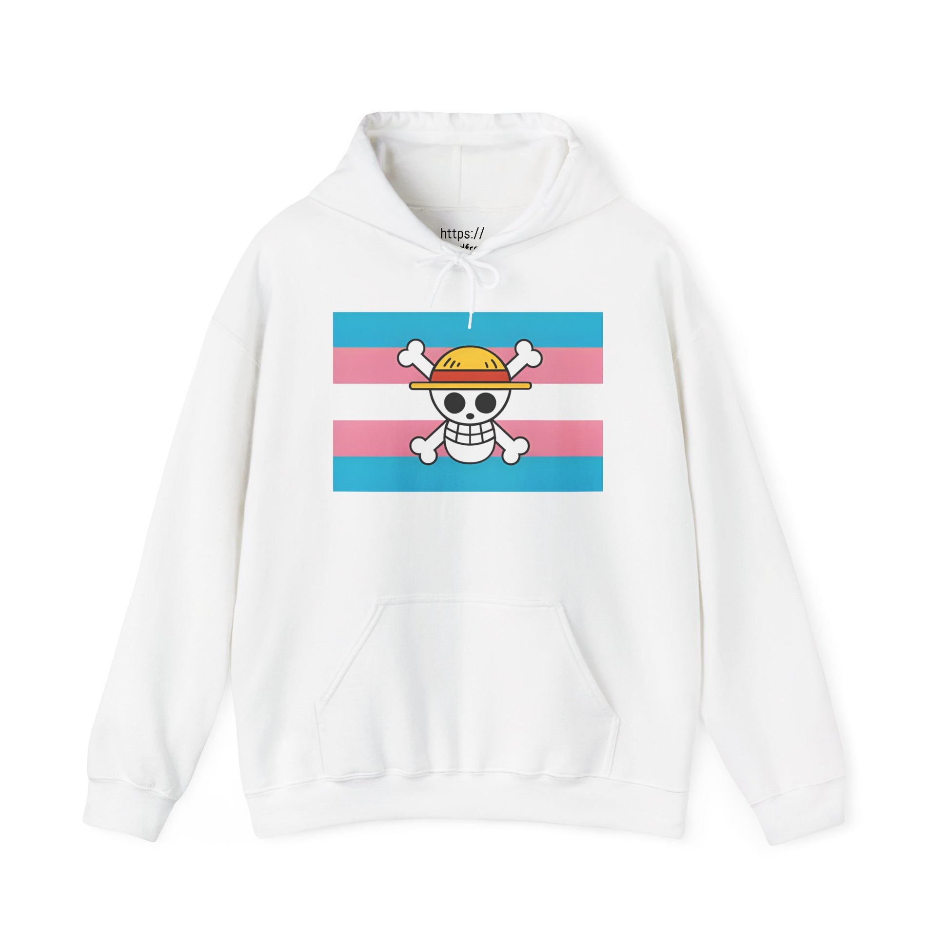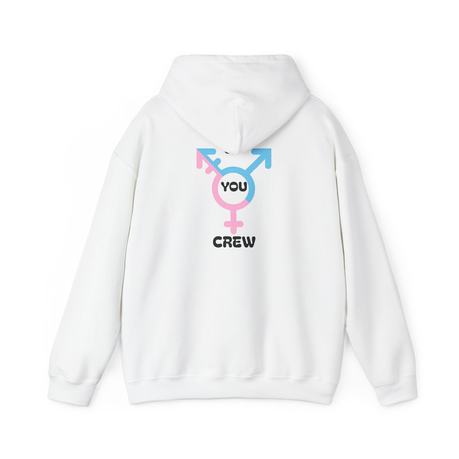 This cozy hooded sweatshirt blends bold identity with everyday comfort. Soft yet durable midweight fabric holds vibrant prints—front chest shows a playful skull-and-crossbones set against trans pride stripes, while the back features a stylized transgender symbol with the words “YOU CREW.” The roomy kangaroo pocket and double-lined hood make it a go-to layer for cool mornings, late-night hangouts, or pride events. Subtle details like a color-matched drawcord, tear-away label, and clean tubular knit keep the feel smooth and easy to wear. Wear it when you want to show quiet confidence, solidarity, and a bit of cheeky charm.